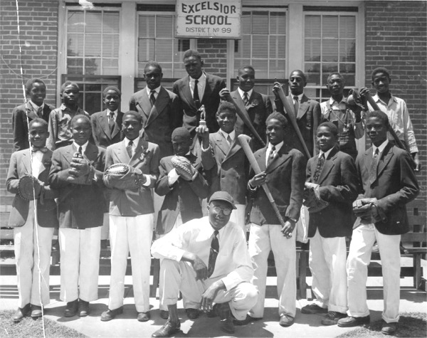 We have not positively identified this group, but we have reason to believe that it is a baseball team at the Excelsior Elementary School in Big Sandy, Texas. Excelsior was a black public elementary school. Internal evidence suggests that ithe photo was taken in the 1950s. |